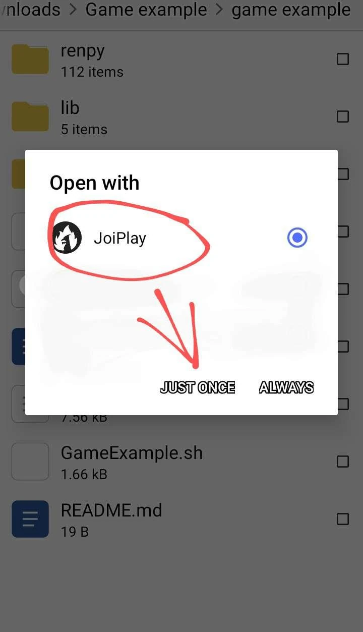 - Open game folder, find game.exe file (not 32.exe) and then just press on it, you will see options what app you want to use to open it, choose JoiPlay.